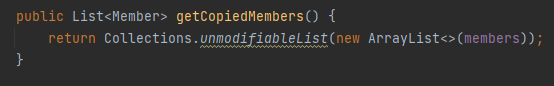 getMembers()를 호출한 클라이언트 쪽에서 리스트에 데이터를 변경하면 잘못된 정보가 전달돼버리고 만다. 그래서 원본이 아닌 복사 데이터를 넘겨줄 필요가 있다.
