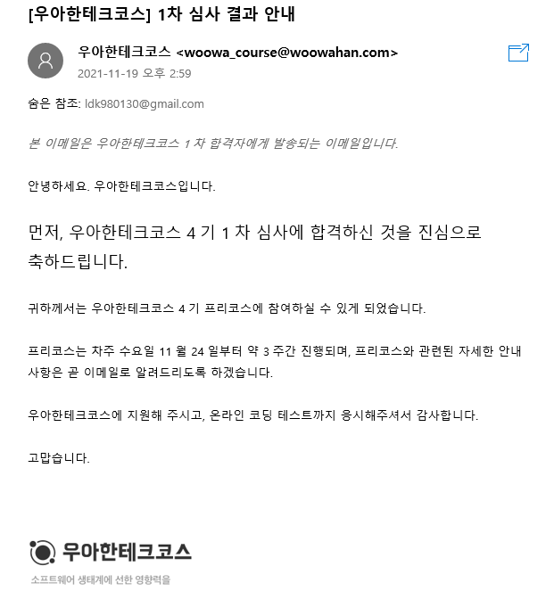 하지만 예상과는 달리 최종 합격 메일을 받았습니다...!!! 최종 결과는 제출한 프리코스 미션, 최종 코딩 테스트, 지원서까지 종합적으로 판단해서 이루어진다고 합니다. 저는 최종 코딩 테스트를 망쳤다고 생각했는데 다른 부분들에서 긍정적인 모습을 보여드린것 같아 붙은 것 같습니다... (아마 백엔드 합격자를 100으로 늘리지 않았다면 떨어졌을 수도 있었겠지만) 2022년에는 우아한테크코스 4기로서 좋은 코치들과 좋은 크루들과 함께 의미있는 한 해를 보낼 수 있을 것 같습니다.