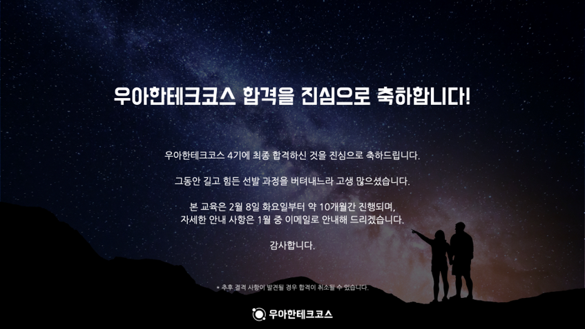 안녕하세요 더즈입니다. 본 포스팅은 우아한테크코스 4기에 지원하고 제목에서도 알 수 있듯이 최종합격까지 할 수 있었던 저의 이야기를 풀어보고자 합니다. 최종합격을 하고 시간이 한 달 가까이 지났지만 첫 블로그 게시글을 우테코 합격 회고로 하고 싶었기에 지금에라도 회고를 작성해봅니다.