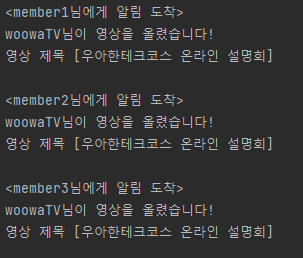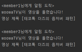 이제 main 메서드에서 실행을 해볼 차례이다. 우선 다음처럼 Subscriber 객체를 생성한 뒤 Youtuber 객체에 등록했다. member1, member2, member3이 woowaTV를 구독했다.