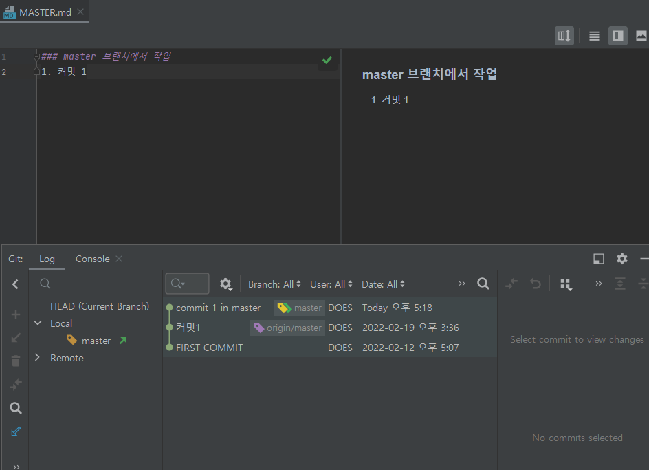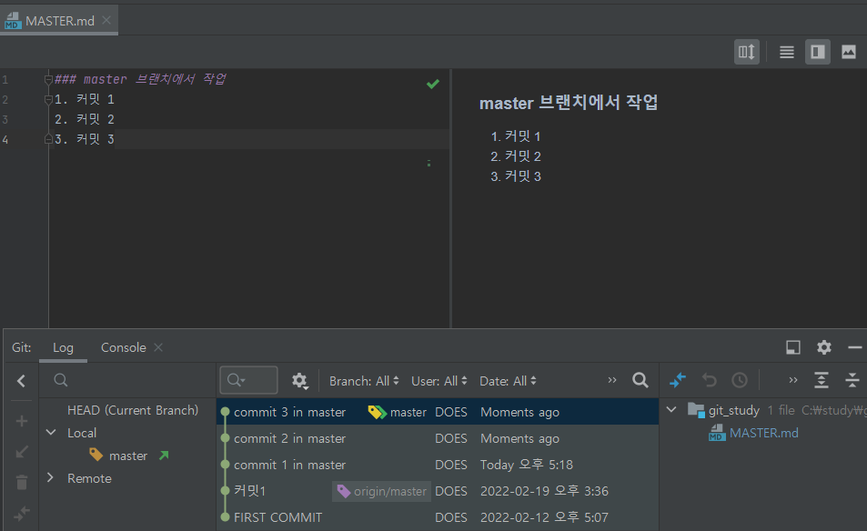 지금부터 merge와 rebase가 어떻게 다른지 브랜치를 나누고 커밋을 다르게 남기며 합쳐보면서 알아보겠다. 현재 브랜치는 master 브랜치 하나만 있는 상황이며 master 브랜치에서 MASTER.md 파일을 수정하고 커밋을 하나 남겼다.