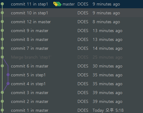 브랜치를 병합하기 전 상태와 똑같은 조건으로 만들기 위해 master에서 3개의 커밋을 남기고 step1 브랜치로 분기한 뒤 2개를 남긴 뒤 다시 master에서 하나를 더 남겨보겠다.