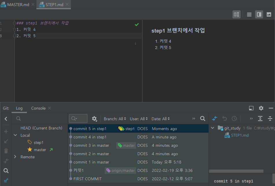 이제 브랜치를 하나 더 생성해서 그 브랜치에서 다른 파일 작업을 해야 한다고 가정하자. 'step1' 브랜치를 생성하고 거기서 커밋 2개를 남겨보겠다.