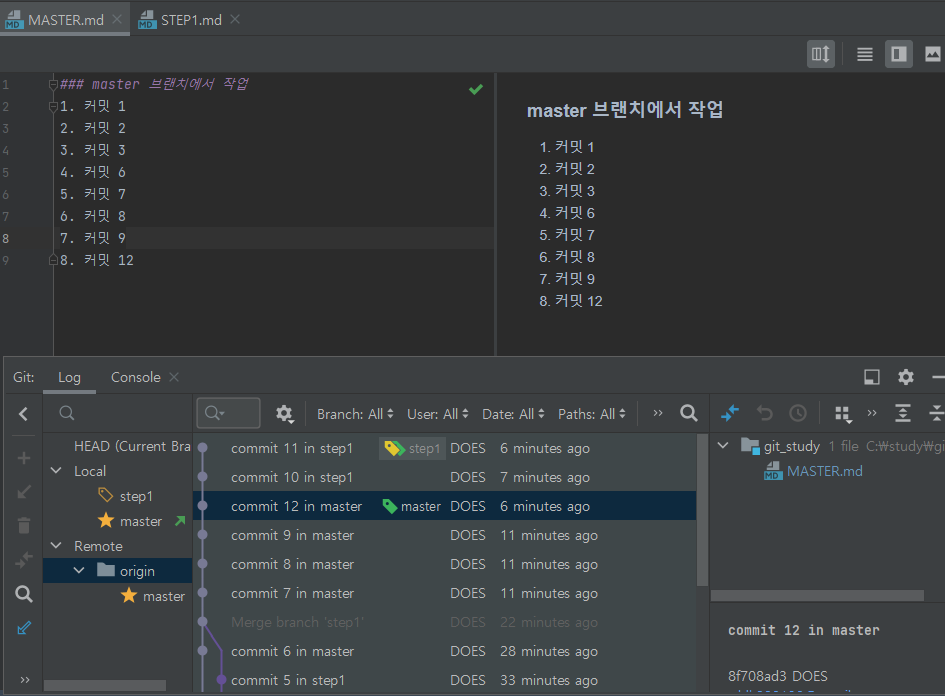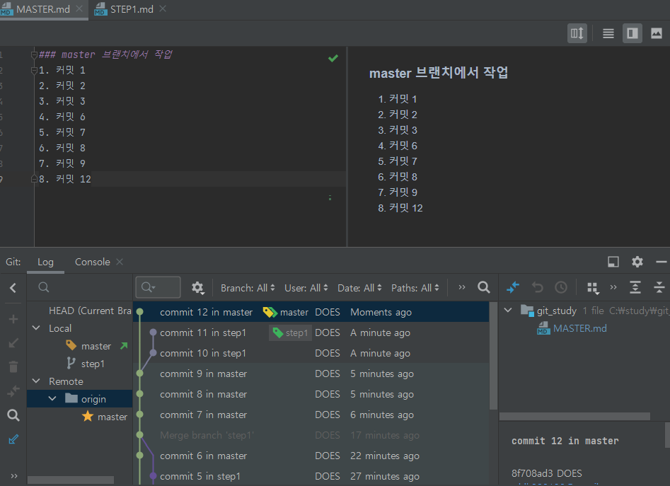 그럼 step1 브랜치에서만 생성하고 작업했던 STEP1.md 파일이 master 브랜치 쪽에서도 생겨나서 브랜치가 병합되었다.