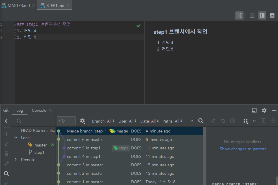 지금끼지의 상황을 정리하면 master 브랜치는MASTER.md 파일에서 작업하며 커밋 1, 2, 3, 6을 남겼고, step1 브랜치는 STEP1.md 파일에서 작업하며 커밋 3부터 분기하여 커밋 4, 5를 남겼다. 이제 브랜치를 합쳐야 할 때가 왔다.