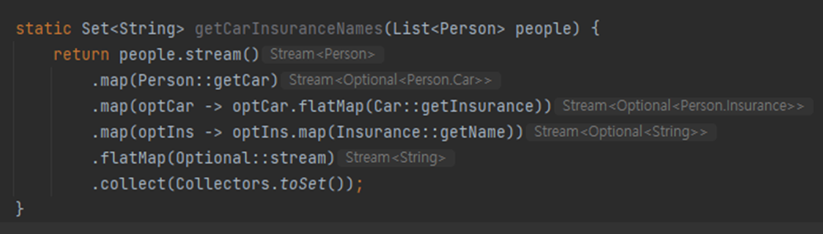 - 위의 예에서 getName()의 반환 타입이 단순한 값일 때는 (String 반환) map을 사용하면 되지만 반환 타입이 Optional<String>이라면 Optioinal<Optional<String>>이 되어 버린다.