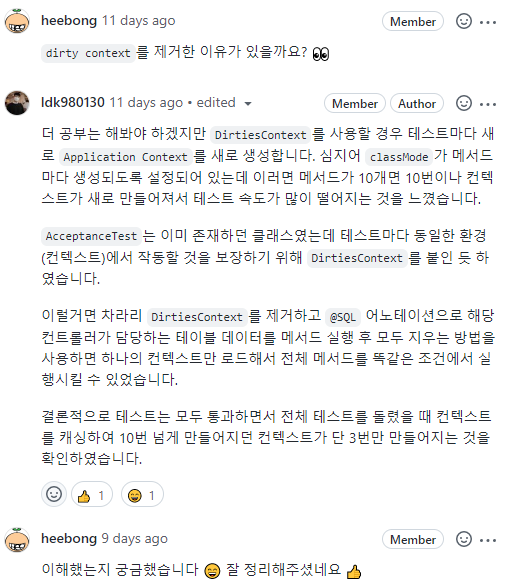 처음 제공받은 코드에서 인수 테스트에서의 테스트 격리를 위해 @DirtiesContext가 붙어 있었고 때문에 테스트 속도가 많이 떨어졌었다.