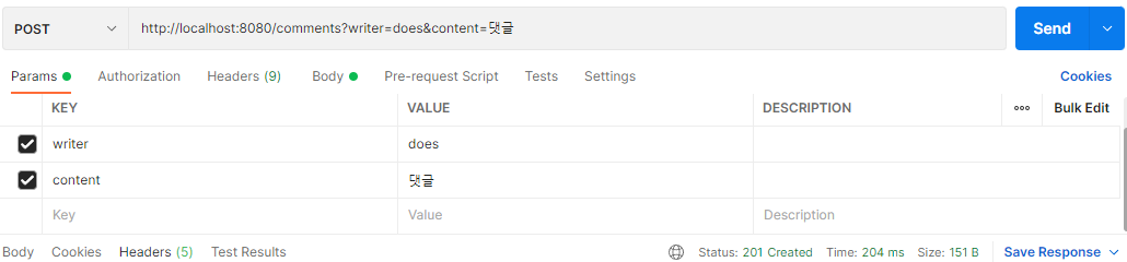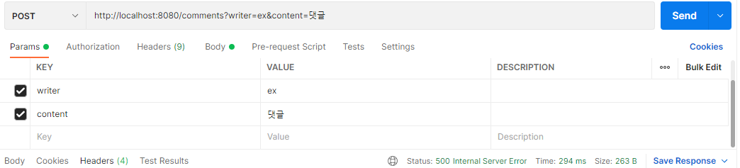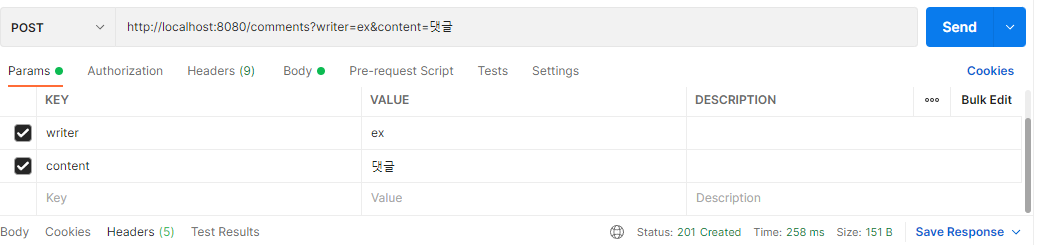- 이렇게 하고 포스트맨으로 ex라는 wirter가 댓글을 작성해보자
