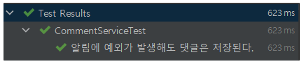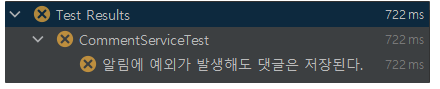 - 알림에서 예외가 발생해서 알림은 DB에 반영되지 않아도 댓글은 DB에 존재해야 함을 확인하는 테스트다.