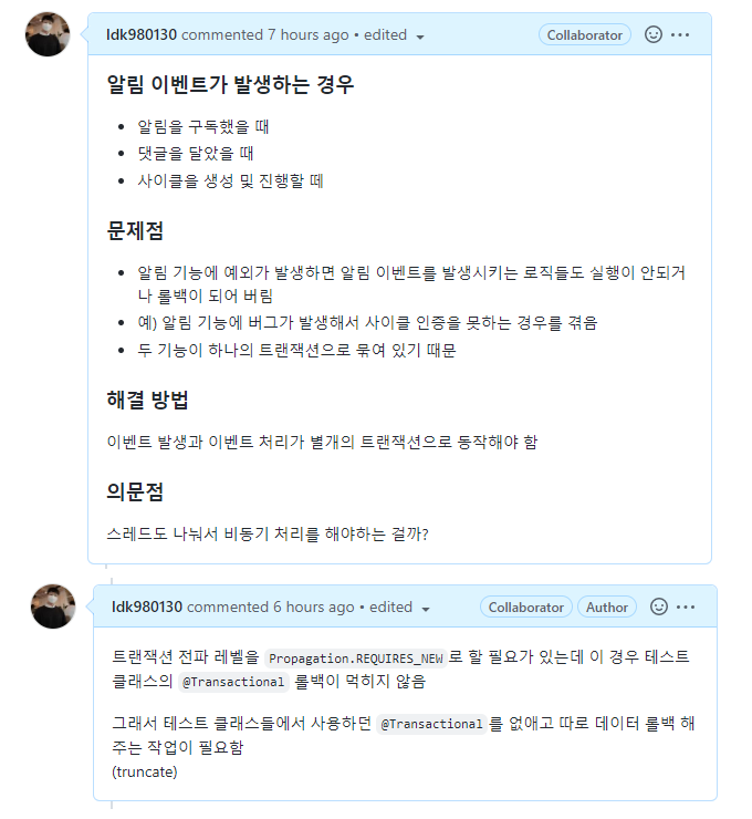 - 때문에 테스트 클래스에 @Transactional이 있으면 위의 "댓글을 저장하면 알림도 저장된다."테스트가 알림 이벤트가 처리되지 않아 DB에 알림이 0개가 되어 실패한다.