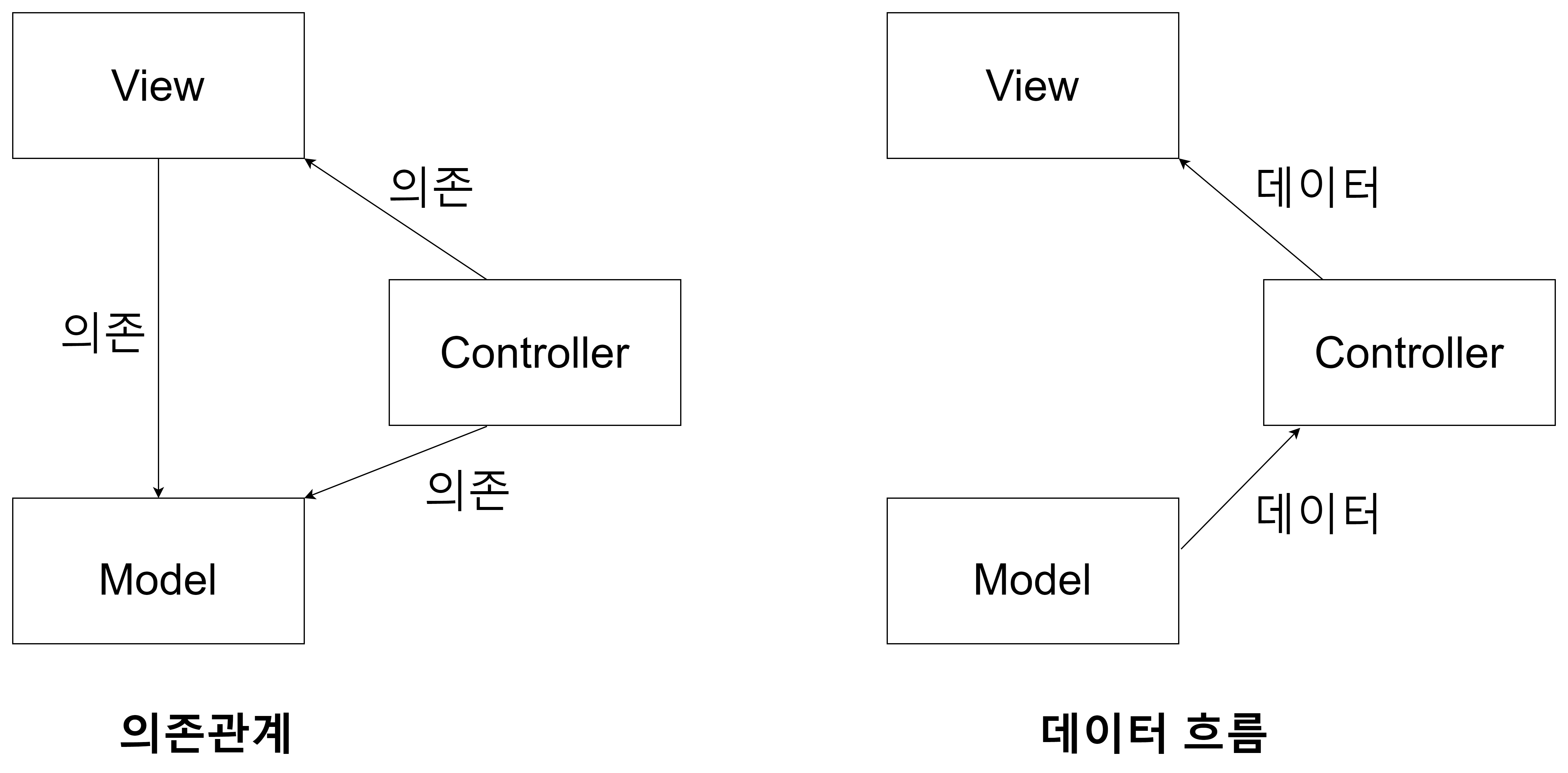 그림으로 나타내면 다음과 같다. 왼쪽 그림이 의존 관계를 나타낸 것이고 유의점 1, 2, 3번을, 오른쪽 그림이 5번을 설명해준다. 무엇보다 핵심은 비즈니스 로직과 뷰의 철저한 분리이다. 비즈니스 로직과 뷰가 각자만 변경되어도 서로를 터치할 일을 최대한 줄이거나 없애야 한다. 특히 대부분의 애플리케이션들은 비즈니스 로직에 비해 뷰의 변경 가능성이 많다. 뷰가 변경되어도 비즈니스 로직이 바뀌지 않으면 분리가 잘 이루어졌다고 말할 수 있을 것이다.