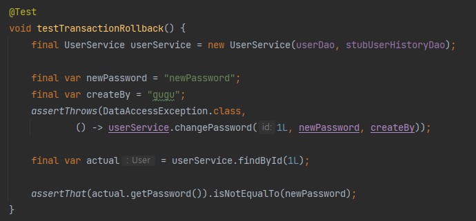 아래의 테스트에서 stubUserHistoryDao는 현재 log 메서드를 호출하면 예외가 발생하도록 되어 있다. 때문에 channgePassword를 하면 user의 비밀번호는 update하지만 log를 호출하면서 예외가 발생한다. 트랜잭션이 적용된다면 원래 비밀번호가 새로운 비밀번호와 같지 않다는 아래 테스트는 통과해야 한다.
