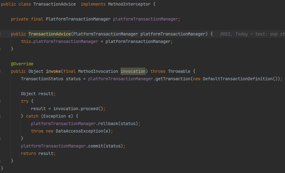 MethodInterceptor는 Interceptor를, Interceptor는 Advice 인터페이스를 상속한다. invoke 메서드를 오버라이드 하여 트랜잭션 처리 부가 기능을 추가했다. MethodInvocation 객체 안에 메서드를 호출하는 방법, 현재 프록시, 메서드 매개 변수, 메서드 정보 등이 포함되어 있어서 proceed() 메서드를 호출하는 것으로 실제 기능을 호출할 수 있게 된다.
