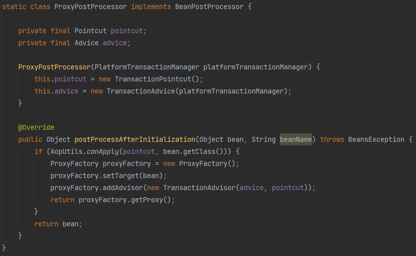 BeanPostProcessor 인터페이스를 구현하여 만들 수 있다. 아래 코드는 어떤 빈이 TransactionPointcut을 만족하면 프록시로 바꿔 칠 수 있도록 구현했다.