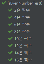 dynamicTest()는 DynamicTest 타입을 반환하는 생성 메서드로 예시와 같이 DynamicTest를 인스턴스로 가지는 Stream을 반환하면 각 숫자에 대해 테스트를 진행한다. Stream이 아니라 Collection이나 Iterator를 반환해도 되는데 자세한 내용은 링크 참조하면 이해할 수 있을 것이다. 위 테스트를 실행하면 결과는 다음과 같다.