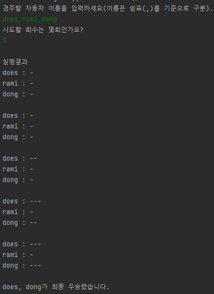 자동차 경주 게임을 구현한다고 가정하자. 자세한 설명은 생략하고 차 이름을 입력받아 시도 횟수만큼 전진시킨 뒤에 결과를 출력하는 애플리케이션이다. 전진 조건은 9 이하 정수를 랜덤으로 받아 4 이상이면 전진한다. 실행 예시는 다음과 같다.
